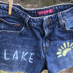 Painted cutoff denim short shorts, junior's size 9. This cute pair of jeans has been upcycled by cutting them off into shorts and with painting done on the front in a lake theme.
