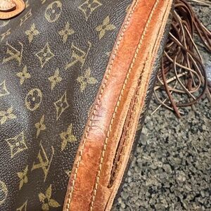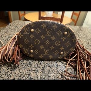 Upcycled Louis Vuitton bucket bag with fringe. Bought from vintage boho bags. Comes from a smoke free home. Still has lots of life to live. The leather at the bottom is separating, however, is fixable at a leather shop etc. Otherwise, the bag is in great shape.