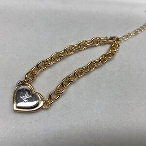 Upcycled Louis Vuitton heart magnet handmade into a bracelet. Bracelet is plated gold over stainless steel link chain. Bracelet is adjustable 7-9”