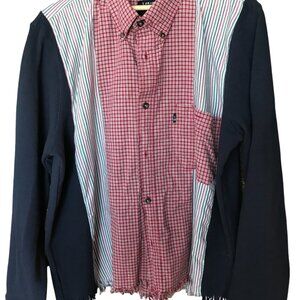 Upcycled oversized mixed print button-down shirt, size medium to large, red plaid and striped shirt combined with navy waffle knit sleeves. This reworked spliced shirt with 1 pocket and fringy hem would make a cool, unique addition to your wardrobe if you enjoy the funky, quirky style!