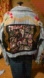 Upcycled with application of T-shirt to back and then embroidered T with quilt batting. T-shirt graphics embroidered in red and gold. A hambre gold tone thread was used to embroider the snake grasping tulips and frames the T.S. Reputation graphics. "Molly Made It" upcycle. design.