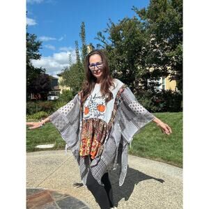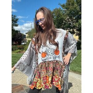 Brand-new graphic tee transformed with recycled chiffon, rayon, and jersey-knit panels. Flowing poncho/tunic silhouette—perfect for fall vibes, Halloween, and Thanksgiving. One of a kind.