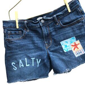Painted and patched cutoff denim shorts, junior size 8, ocean theme. This is a cute pair of jeans that have been upcycled by turning them into cutoff jean shorts, applying handmade patches and painting the word "Salty" on the front.