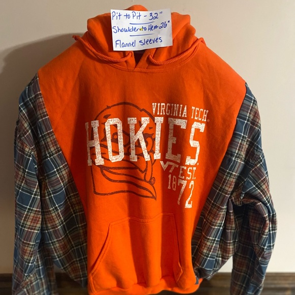 Upcycled Orange Virginia Tech Hokies Hoodie with Flannel Sleeves size XL