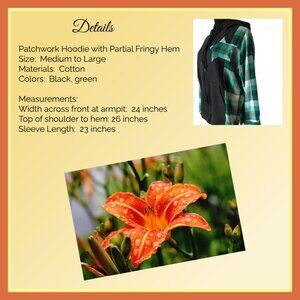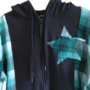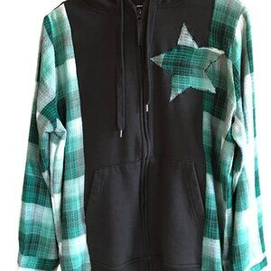 Patchwork hoodie full-zip jacket, size medium to large. A little grunge, a little edgy, totally original — this zippered patchwork hoodie jacket is the perfect cozy layer for your streetwear or campus look. Built on a black zip-up hoodie base, this one-of-a-kind piece features green plaid flannel sleeves, a star patch on the front, and a partial fringy hem to add to its deconstructed, edgy look. Perfect for chilly campus days, concerts, or layering up in bold, rebellious style.