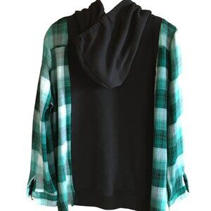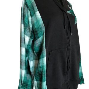 Green plaid flannel sleeves spliced with a black full-zip hoodie jacket