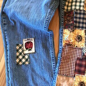 Upcycled Patchwork Jeans, 16P: Plaids, Spring Garden Sunflower Patches, Reworked