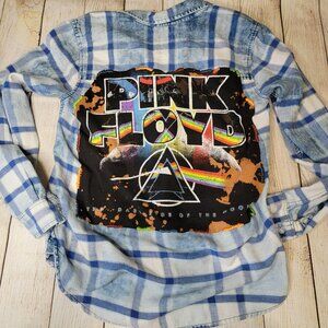 Upcycled Pink Floyd Band Tee Plaid Shirt, size medium