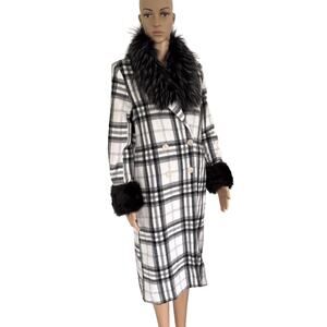 Black and white plaid long coat with detachable faux fur collar and cuffs