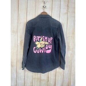 Custom Made- One of a Kind Western Featuring a vibrant “ Put Em’ Up Cowboy” graphic on back. This is an up-cycled, reworked item.