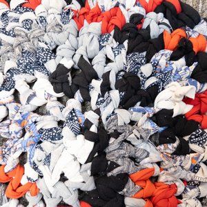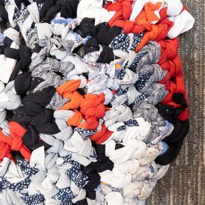 I handmade this Rag Rug out of clothes I didn't sell. Most the fabrics are 100% Cotton. Collors consist of red, white, black with splashed of blue and it measures 21" around. Machine washable.