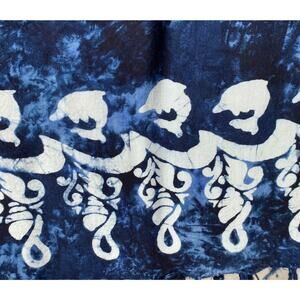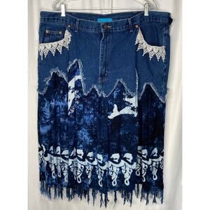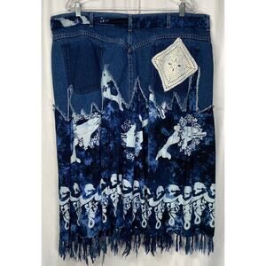 Repurposed stretch denim jeans Upcycled to skirt with added self tie belt. Skirt bottom is batik print scarf with dolphin pattern. Fringed bottom. Item has been machine washed & dried. Size 26. Please refer to photos for measurements. From a smoke free, pet free environment.