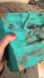 This is a one of a kind rustic look upcycled turquoise color wooden storage box with a metal longhorn skull decoration on top.