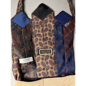 Unique handmade shoulder bag crafted from repurposed designer silk neckties. The blend of paisley and geometric prints in rich navy, burgundy, and tan tones creates a refined, vintage-inspired look. Built with a soft, sturdy neutral base fabric and fully lined in coordinating silk for a polished finish. Features a tie strap, exterior and interior slip pockets, and thoughtful button accents—both stylish and functional.