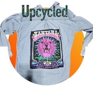 ๐พ Totally unique and vintage! This upcycled denim shirt features a fun Santana Woodstock 1969 graphic patch sewn on the back and a Snoopy & Friends logo on the front โ the ultimate mix of retro and rock vibes.