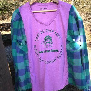 Upcycled reworked tee with flannel sleeves size M-L, Lake of the Ozarks graphic lightweight sweater remake. This is a refashioned shirt with a cute graphic, "I just be over here waitin' for boatin' season."