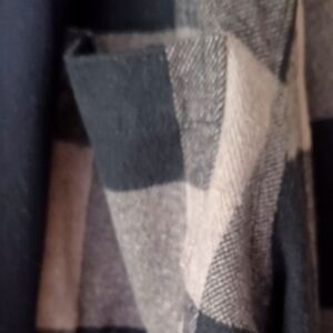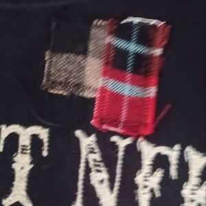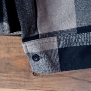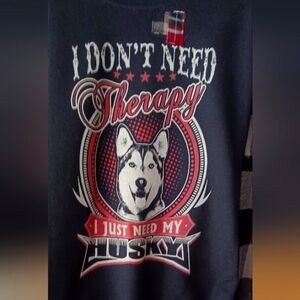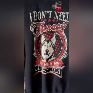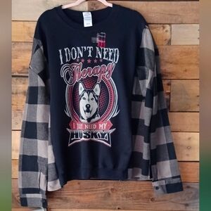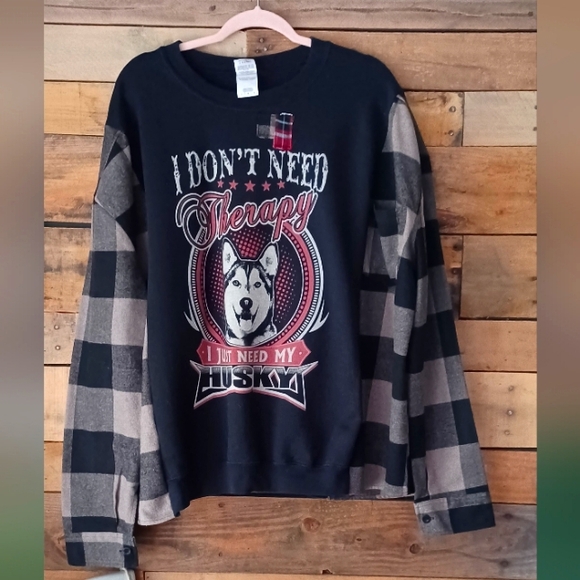 Cozy upcycled sweatshirt with a husky graphic embellished with an upcycled plaid long sleeve sleeves shirt. One-of-a-kind unisex
