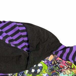 Vibrant kids hooded top featuring purple and black striped sleeves and hood. Colorful graphic front panel adds playful character. Soft, comfortable fabric ideal for everyday wear. Machine washable for easy care. Upcycled. Stitching is not perfect. IMO about a size 8.