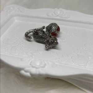 I love cats. My 2 yr old big boy Ash is my best buddy and inspires me to look at all things cat. This little fella was in a box from an estate sale all alone and missing his ornament. He has nicely done red eyes and faux diamonds all over so I gave him a 10mm genuine carnelian bead to play with. His pin is intact and functional. Metal is silver tone. Please examine pics closely and remember that vintage items are not new items.