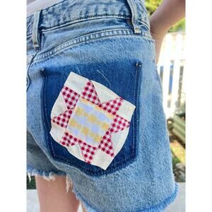 Upcycled Womens Retro High Rise Patchwork Tomato Embroidered Denim Shorts Sz 28