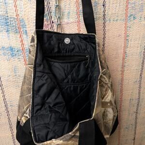 Reworked upcycled tote bag created using authentic Realtree camo fabric and Carhartt canvas.