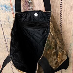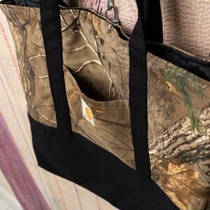 Reworked upcycled tote bag created using authentic Realtree camo fabric and Carhartt canvas.