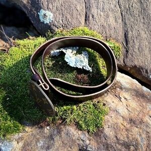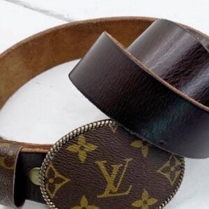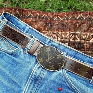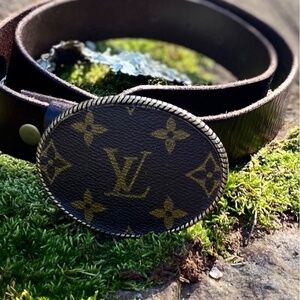 Upcycled harvested Louis Vuitton Revamped handcut leather belt w/ trophy buckle