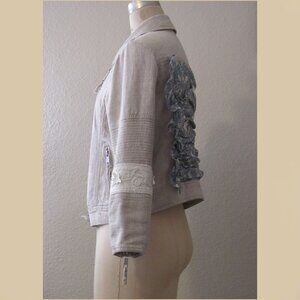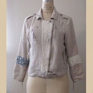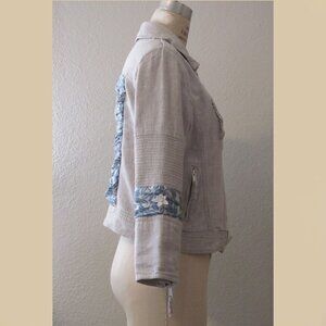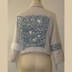 Linen motorcycle jacket cycle with fabric from a dress and a blouse. Lightweight , unlined jacket with perfect for Spring. Front zipper closure, 3/4 length sleeves have zippered cuffs. Epaulets on shoulders. Three zippered pockets.