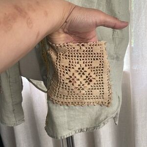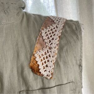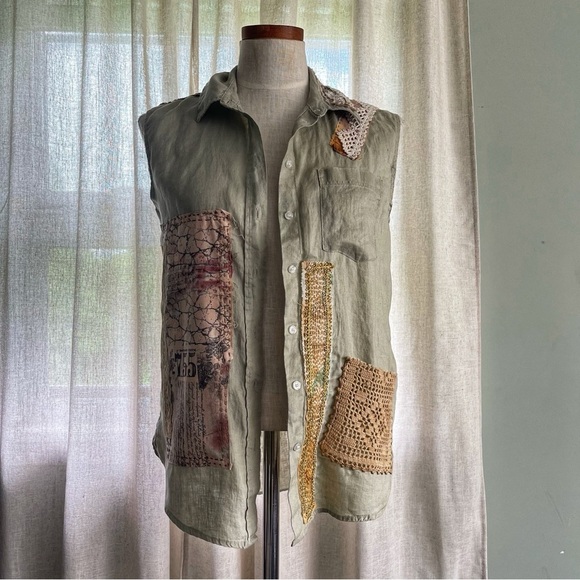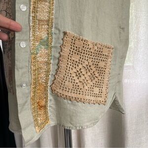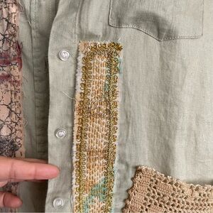 Upcycled patchwork Sage Green Linen shirt wearable art size XS One of a kind