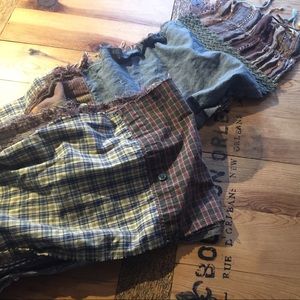 Upcycled from shirts. Usual disclaimer, I'm not a tailor and don't aim for any semblance of perfection when upcycling things, please only purchase if that is acceptable to you. It's got lots of (intentional) fray. It's not stiff & not too bulky.