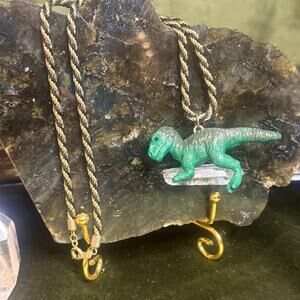 Unique upcycled vintage dinosaur necklace featuring a playful child’s plastic dinosaur perched on a raw clear quartz crystal point. Hand-assembled on a 17-18 inch gold-plated or black & gold vintage cord chain. This eco-conscious piece blends childhood nostalgia with powerful crystal energy. Clear quartz amplifies healing, clarity, and positive vibes, perfect for dinosaur lovers, crystal enthusiasts, and fans of sustainable handmade jewelry. Lightweight, durable, and one-of-a-kind — ideal for everyday wear or gifting. Add a quirky, mystical touch to your style while supporting eco-friendly fashion with this vibrant upcycled dinosaur crystal pendant necklace.
