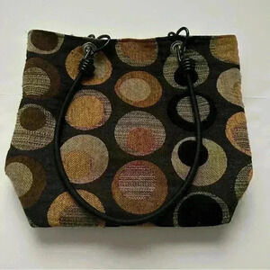 One of a kind vintage style handbag. The handles I think are actually bungee cords. The bag itself looks like a upcycled vintage fabric. The actual fabric is piling a bit. Has a magnetic button closure and some small pockets inside.