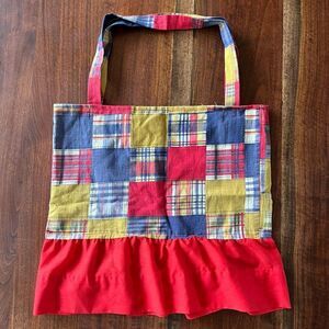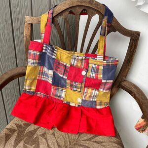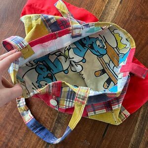 One-of-a-kind, handmade tote bag crafted from vintage and upcycled materials! The exterior features a colorful madras-style patchwork plaid in red, yellow, blue, and green with charming white button accents and a bold red cotton ruffle hem. But the real surprise? The inside is fully lined with vintage Smurfs cartoon fabric—so fun and nostalgic!