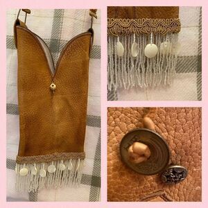 One of a kind upcycled boot purse. This has mixed upcycled materials. Coin, vintage button, shell, silver 925, beads and leather. It’s small could fit a phone and a small wallet etc. see measurements in the photos.