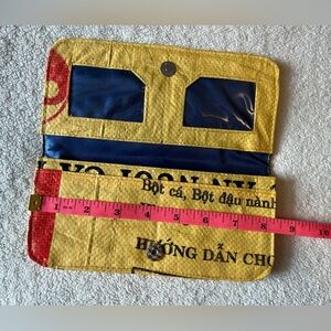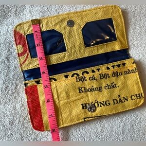 Unique wallet made from recycled rice bag materials. Features yellow and red colors with text design. Snap and zip closures and pockets.