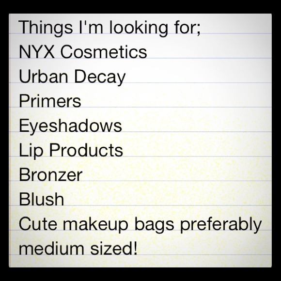 Hello! I saw this and have a lot of the things you have listed in my closet - NYX, Urban Decay, small makeup bag, eyeshadows (rock and republic, Dior, etc) and lip products! Let me know if you are interested =)