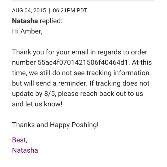 Yeah it sucks, and I feel bad because your getting the bad end of it all. If she didn't ship she should just say so. I think we should wait till the 5th and if no response from nicole to contact posh again. It's basically like theft right? Maybe posh will do something.