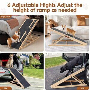 6 Adjustable Heights: Our pet ramp with a gentle incline offer adjustable heights: 15.7", 18.5", 20.9", 23.2", 25.4", 27.6" Intended to adapt to small medium, and large-sized dogs, cats, old dog, injured dogs and pets climbing high beds, cars, tall couches, and chairs with ease. our pet ramps fit most furniture and cars in your home.