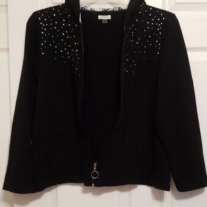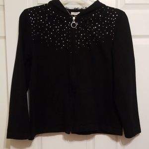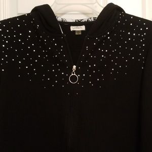 Black zip up hoodie with sparkle gems across upper front. Hood is black and white print for a nice contrast. See pic. Bust: 44" Armpit to hem: 14" Sleeve: 23"