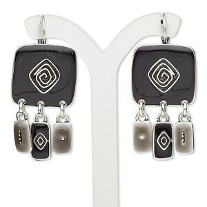 Updated Mid Century Style Black Gray Enameled Rectangles Silver Accents Earrings