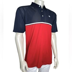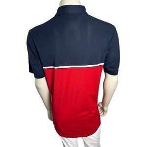 Like new, this high-performance shirt is a must-have for any golfer. 100% polyester, this lightweight performance-wicking fabrication is excellent quality, in red, white and navy, and finished with laser-engraved buttons