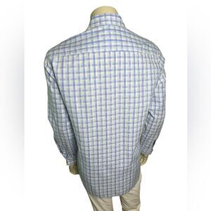 Made from premium fabrics, this Pronto-Uomo dress shirt offers a sleek and modern fit that will elevate any casual or formal outfit. Experience the luxury of breathable 100% cotton and impeccable craftsmanship, featuring white, indigo, and light blue plaid, with stitch detailing on the collar. Worn once, this shirt is in perfect like new condition. The XL measures as follows: