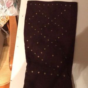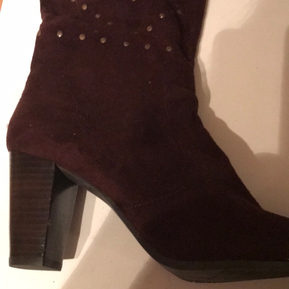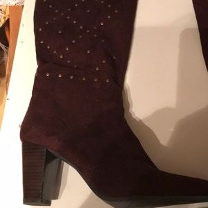 Knee high wine colored with21/2 inch heels pretty bronze pattern all the way to the knee. These have never been worn. 71/2