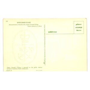 Vintage postcard showcasing a demonstration of handicrafts in Upper Canada Village. Features two women in period attire engaged in crafting. Color photo by V. Brais.