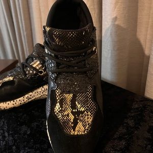 Upper black and gold snake print with polka dot black and white sole.