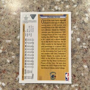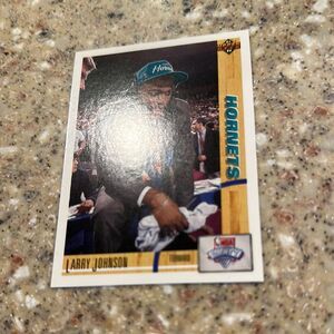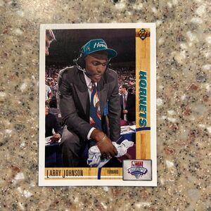Collect the iconic Upper Deck NBA trading card featuring Larry Johnson. This card showcases vibrant blue and gold colors, perfect for any basketball fan's collection.