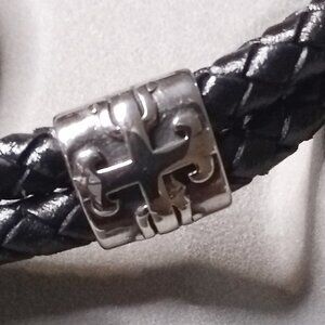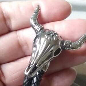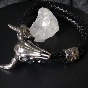 Definitely a statement bracelet!!! The big, raised up, stainless steel steer bull cow skull is something that will stand out and get noticed. This is a loop and double slider bracelet, with top quality, genuine, braided black leather [and thick leather cordage too] and massive slider pieces. To open it, slide back the winged crown slider to relax the loop as far back as you need, to slide it over the horned skull. Close the loop by sliding the crown back towards the skull. A second slider embossed with a cross, can be adjusted anywhere on the bracelet, as it pleases you.