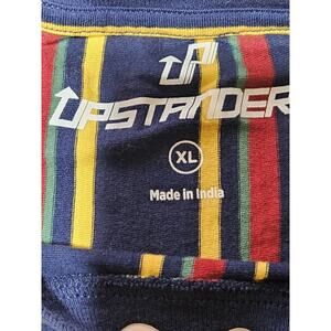 The shirt is embroidered with the Upstanders character family logo and is perfect for those who want to make a statement with their clothing. It is a regular fit and comes in size XL. This shirt is ideal for anyone who loves color and wants to showcase their unique style.