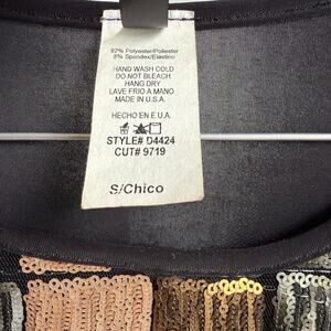 This is a pre-owned Uptown U.S.A. dress, size S/Chico. The dress features long, sheer black sleeves and a bodycon fit. The main body of the dress is adorned with a sequined pattern of gold, silver, and rose gold squares. The material composition is 92% polyester and 8% spandex. There are no immediately noticeable imperfections.