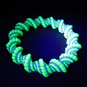 This listing is for the handwoven Cellini spiral bangle pictured. It was handwoven one bead at a time using alternating silver lined light turquoise or shiny Tiffany blue colored beads and Uranium glass seed beads that react under blacklight due to the Uranium used in coloring the beads. It glows very bright.